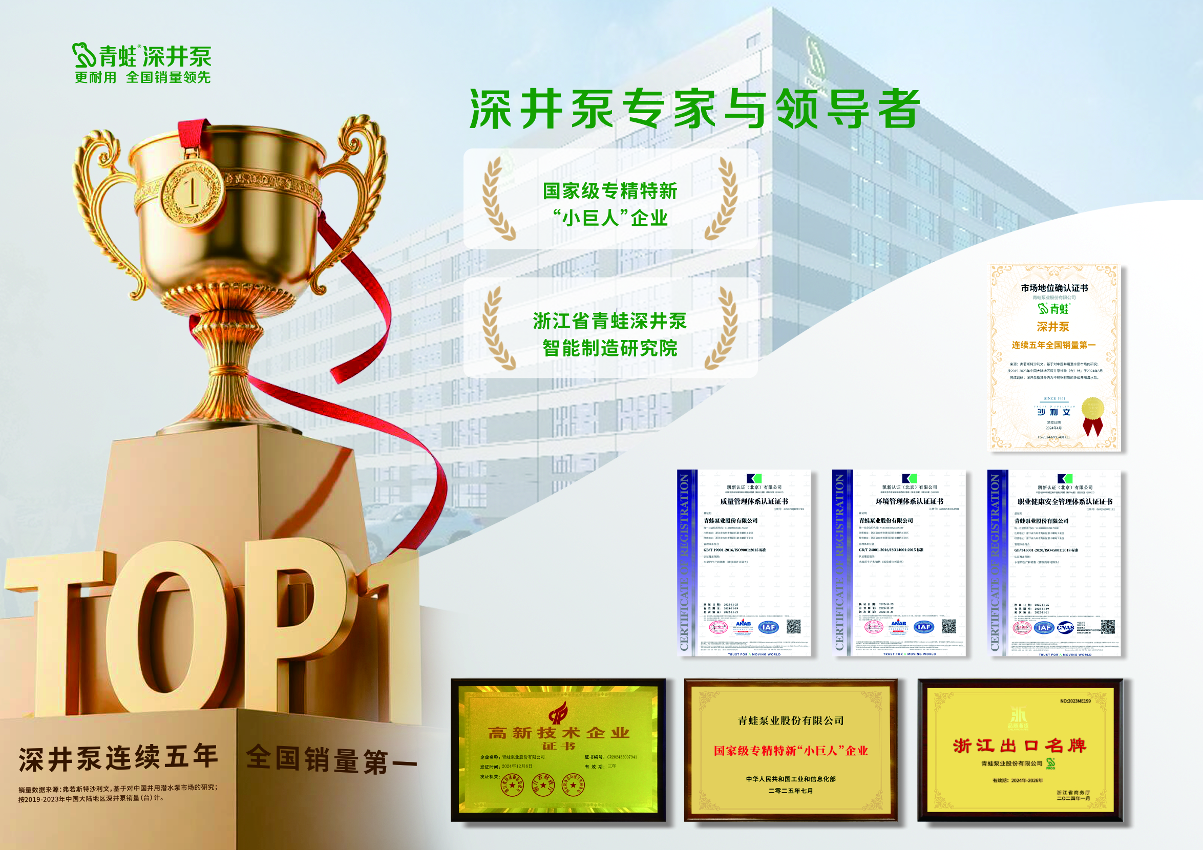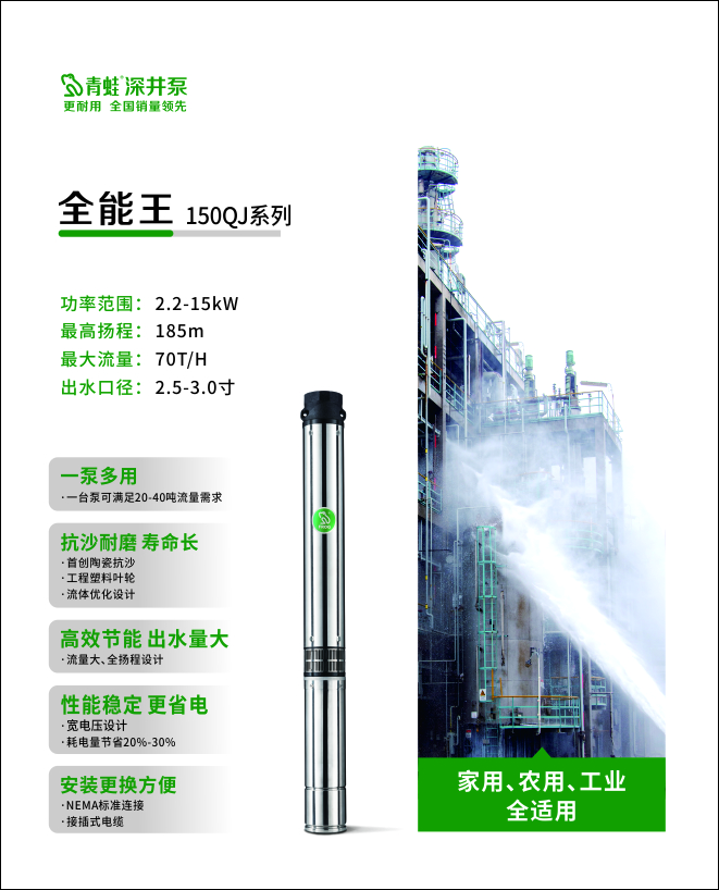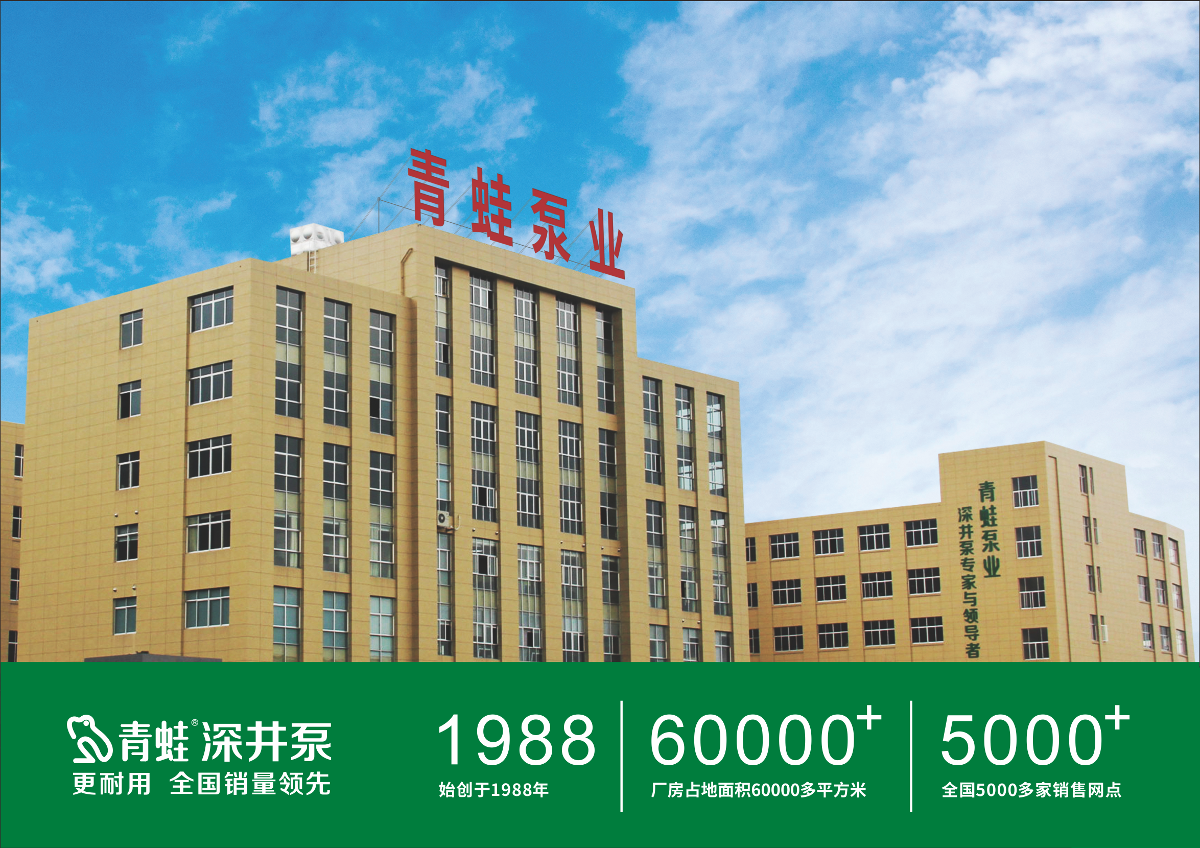青蛙泵业股份有限公司始创于1988年,专注于井用潜水泵的研发、制造与销售,是目前井用潜水泵研发与推广应用的主要引领者之一。井用潜水泵连续多年在全国销量排名第一。